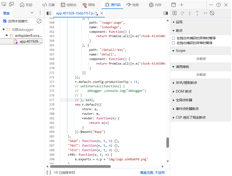 定位目标文件:在开发者工具的“源代码”面板中,找到包含无限debugger的JS文件。