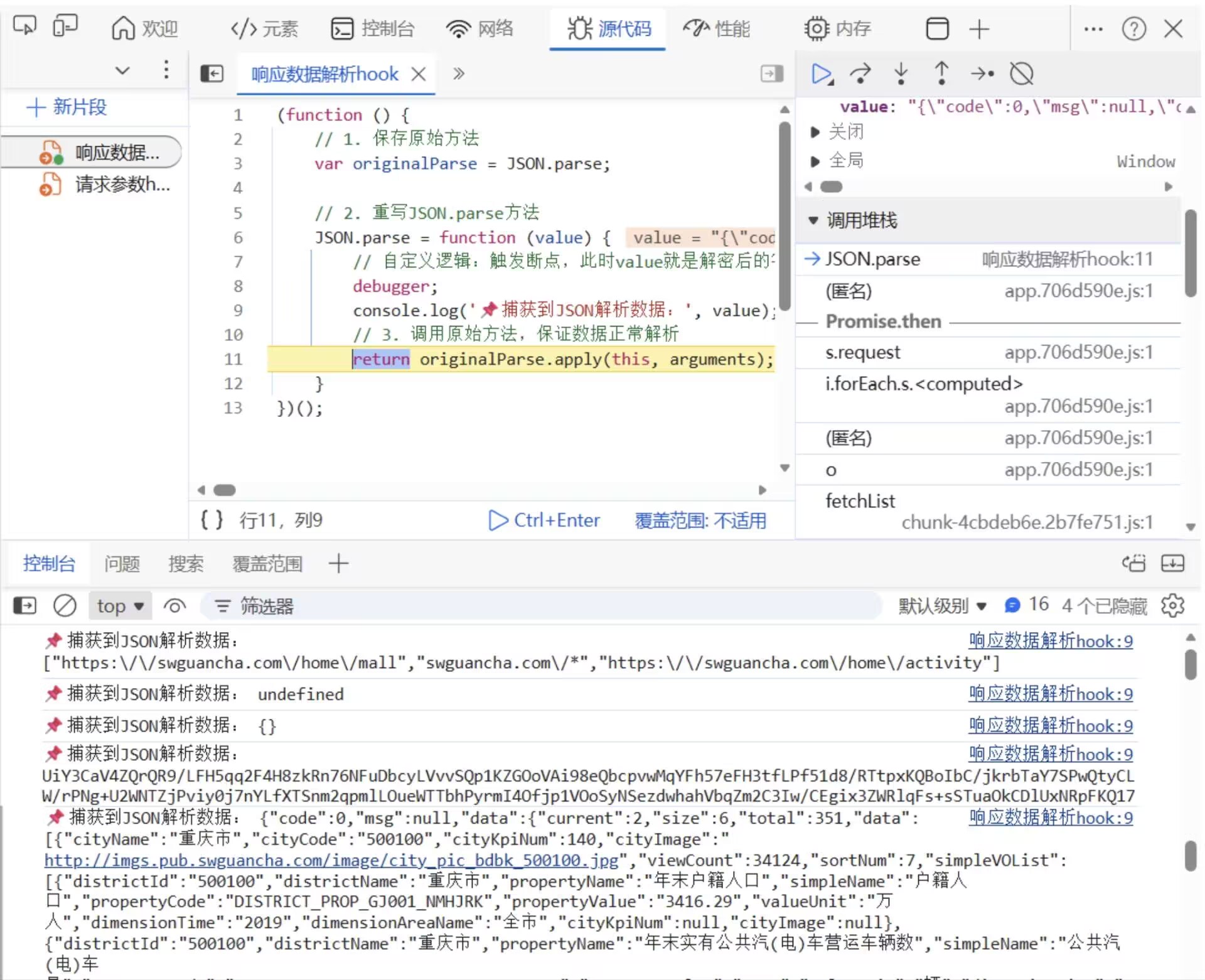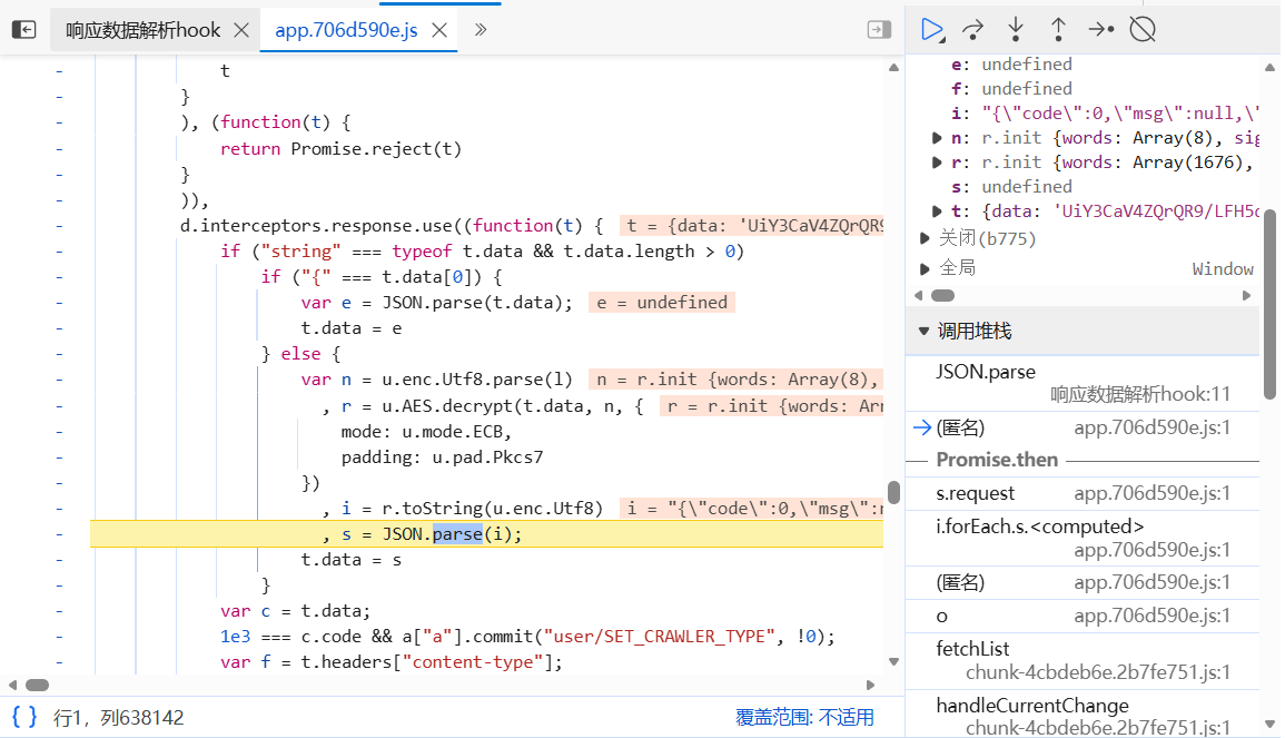 思路:重写JSON.parse方法,在解析数据时触发断点,通过调用栈回溯到解密函数。