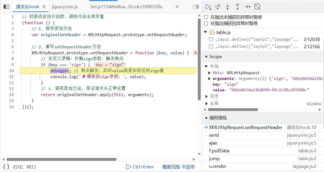 思路:重写XMLHttpRequest.prototype.setRequestHeader(设置请求头的方法),拦截sign参数的设置过程。