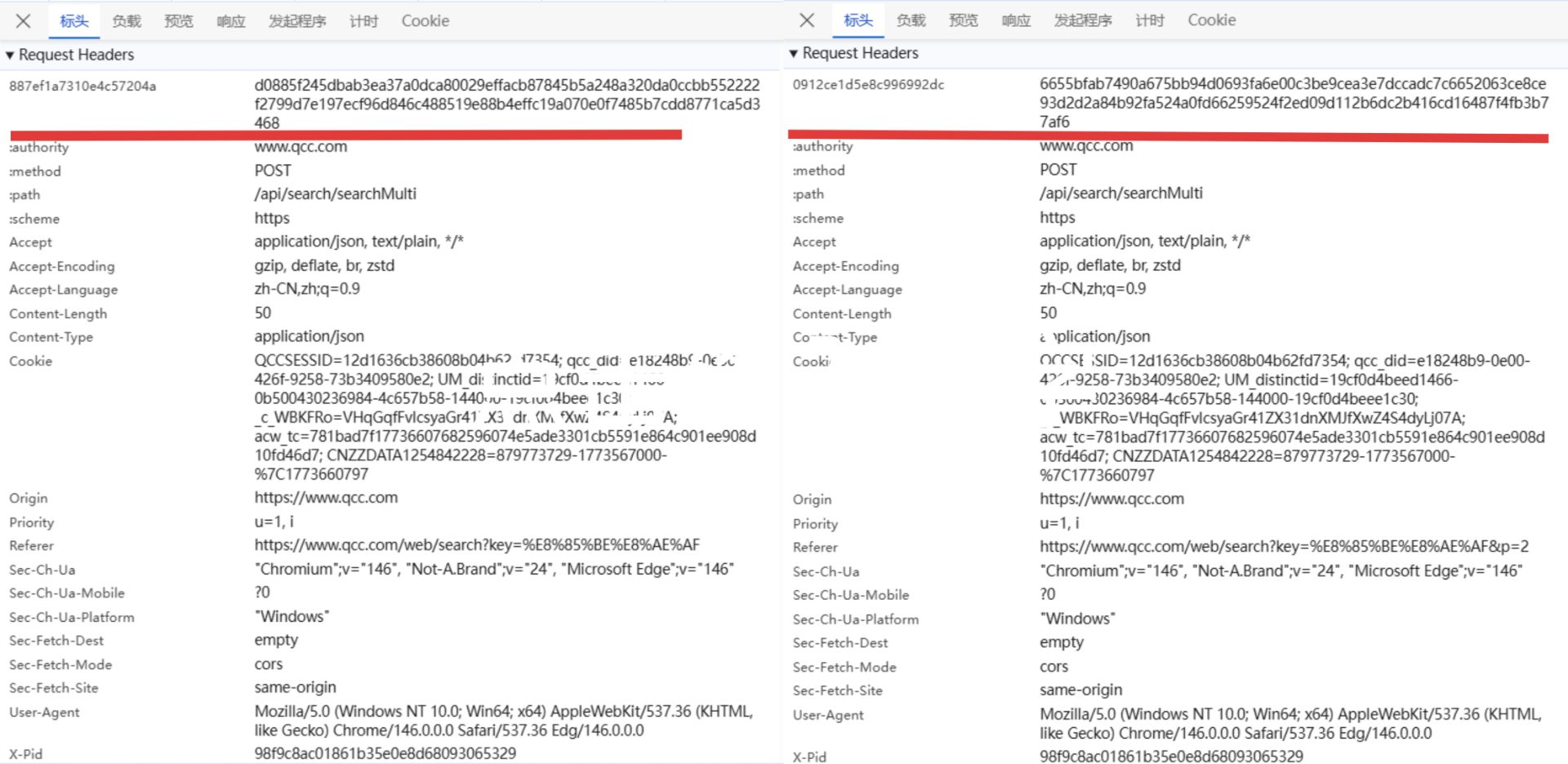 可以发现请求头中有一组动态变化的键值对。请求头中,键名如 887ef和 0912c等,键值如 d0885 和 6655b等,每次请求都会变化。