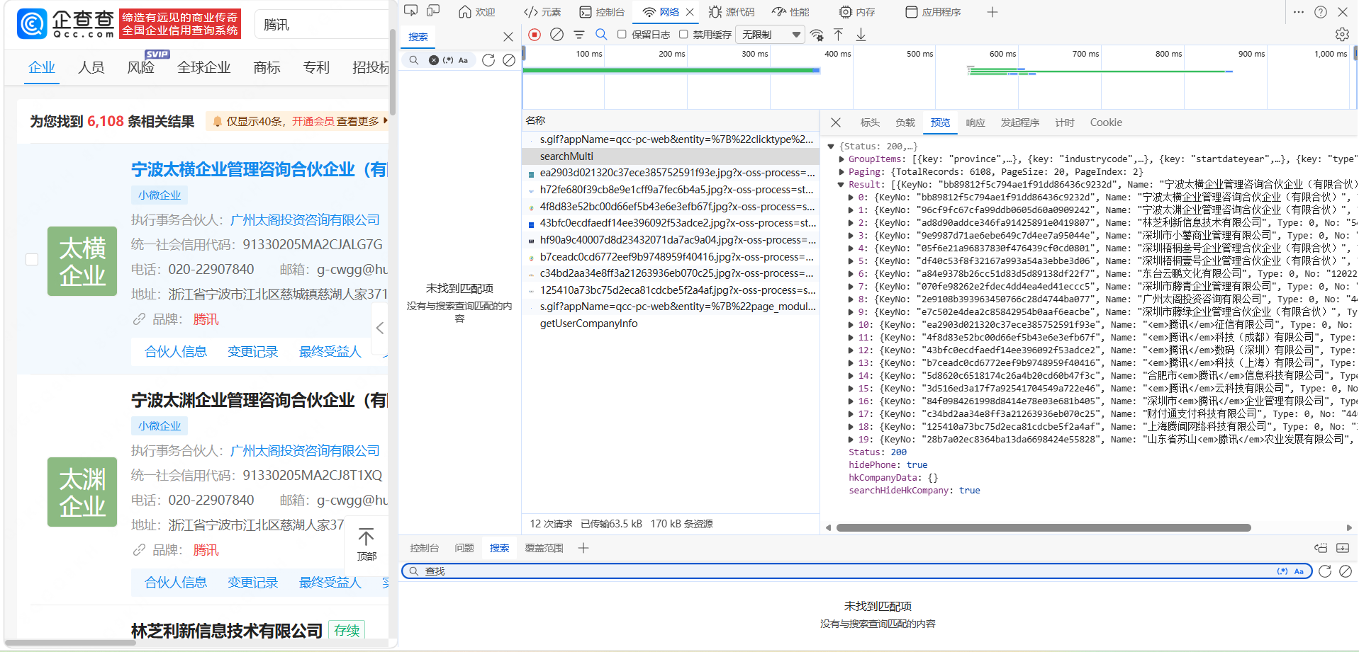 点击 searchMulti请求,展开 Result 字段,查看返回的公司信息,这些就是我们需要的爬取数据。