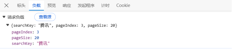 即 e = e.data={"searchKey": "腾讯","pageIndex": 2,"pageSize": 20}