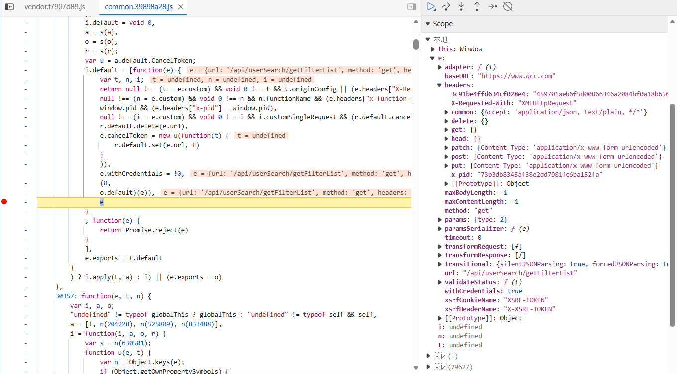 在代码执行到 o.default(e) 后,发现 e.headers 中出现了加密后的请求头。