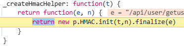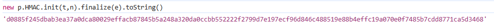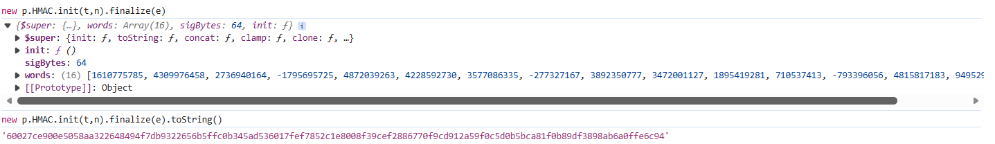 .toString()得到的是 128 个十六进制字符(64 字节),只要输入的t(密钥)、n(算法)、e(数据)固定,签名结果就完全固定。库来源大概率是 CryptoJS:对象结构(