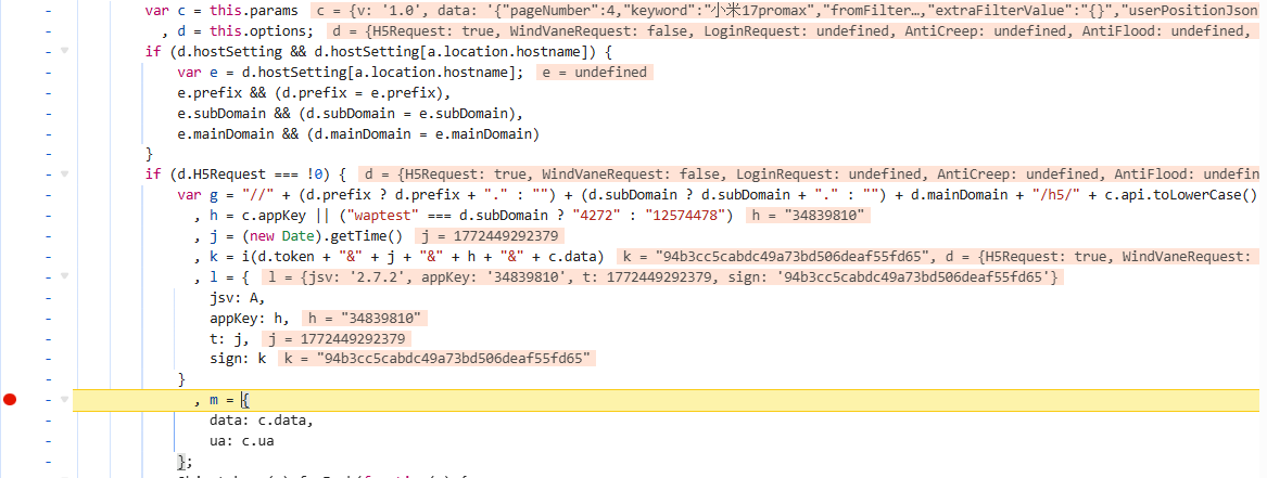 核心拼接模板为{token}&{t}&{appKey}&{data},将拼接好的字符串传i方法,即可生成 32/64 位十六进制签名串,参数顺序、格式(无多余空格 / 换行)必须完全匹配,否则签名失效。token为前端会话密钥(token在Console控制台多次打印,看起来是恒定的,其实不然,而是大约一个半小时会发生变化,所以应该定位token生成)